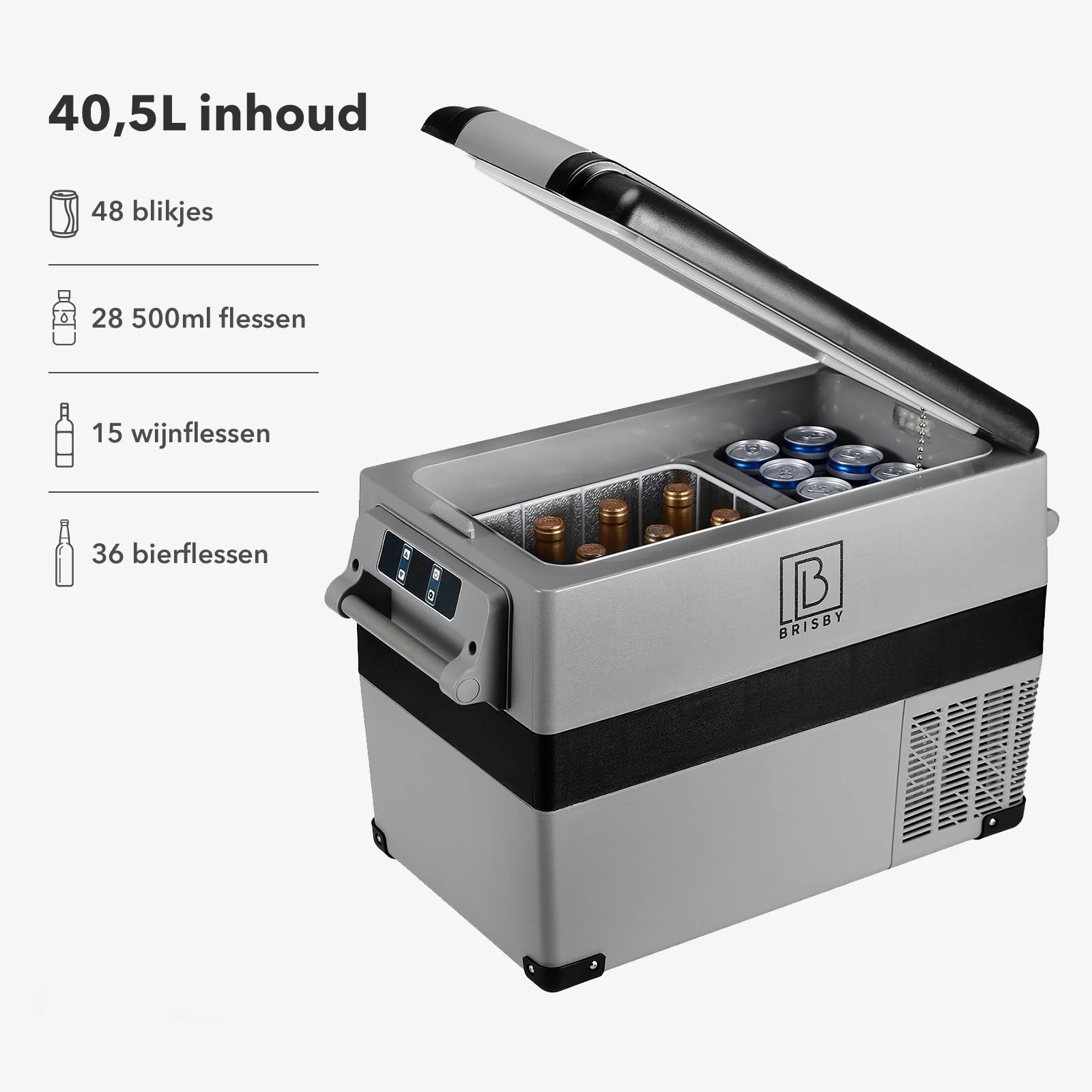 - Inhoud 40,5 L: ruimte voor 48 blikjes (330 ml), 28 flesjes (500 ml) of 15 wijnflessen